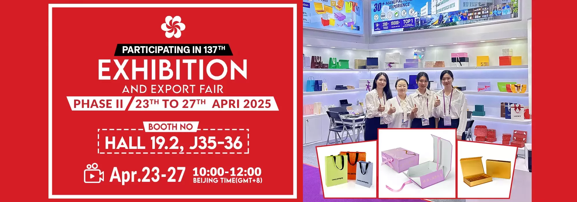 Del 23 al 27 de abril, nos vemos en la Feria de Cantón de Primavera de China. Nuestro stand es HALL 19.2, J35-36. Elija Xiamen Hengxing Color Printing y recibirá productos de embalaje de papel de alta calidad, soluciones de embalaje ecológicas y servicios profesionales eficientes. ¡Únase a nosotros para crear un mundo brillante! ¡Seamos testigos de la excelencia y creemos juntos un mundo brillante!