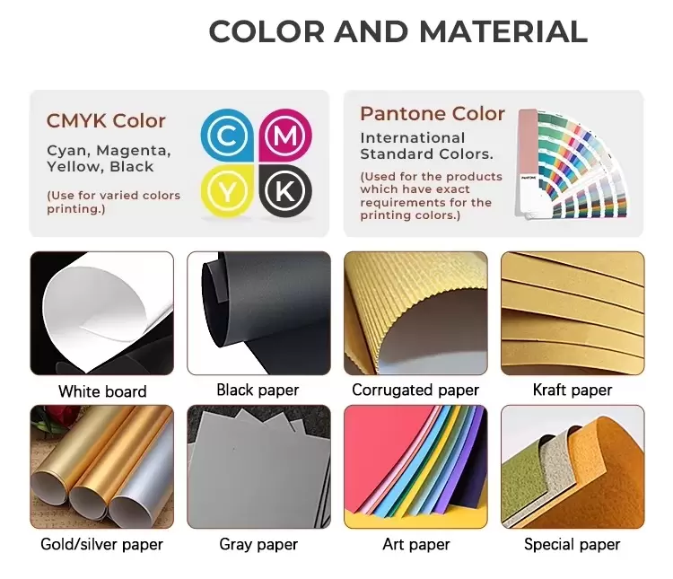 Material: Papel corrugado, cartón blanco, cartón negro, papel Kraft, papel marfil, papel de arte, CCMB, CCNB, etc.
